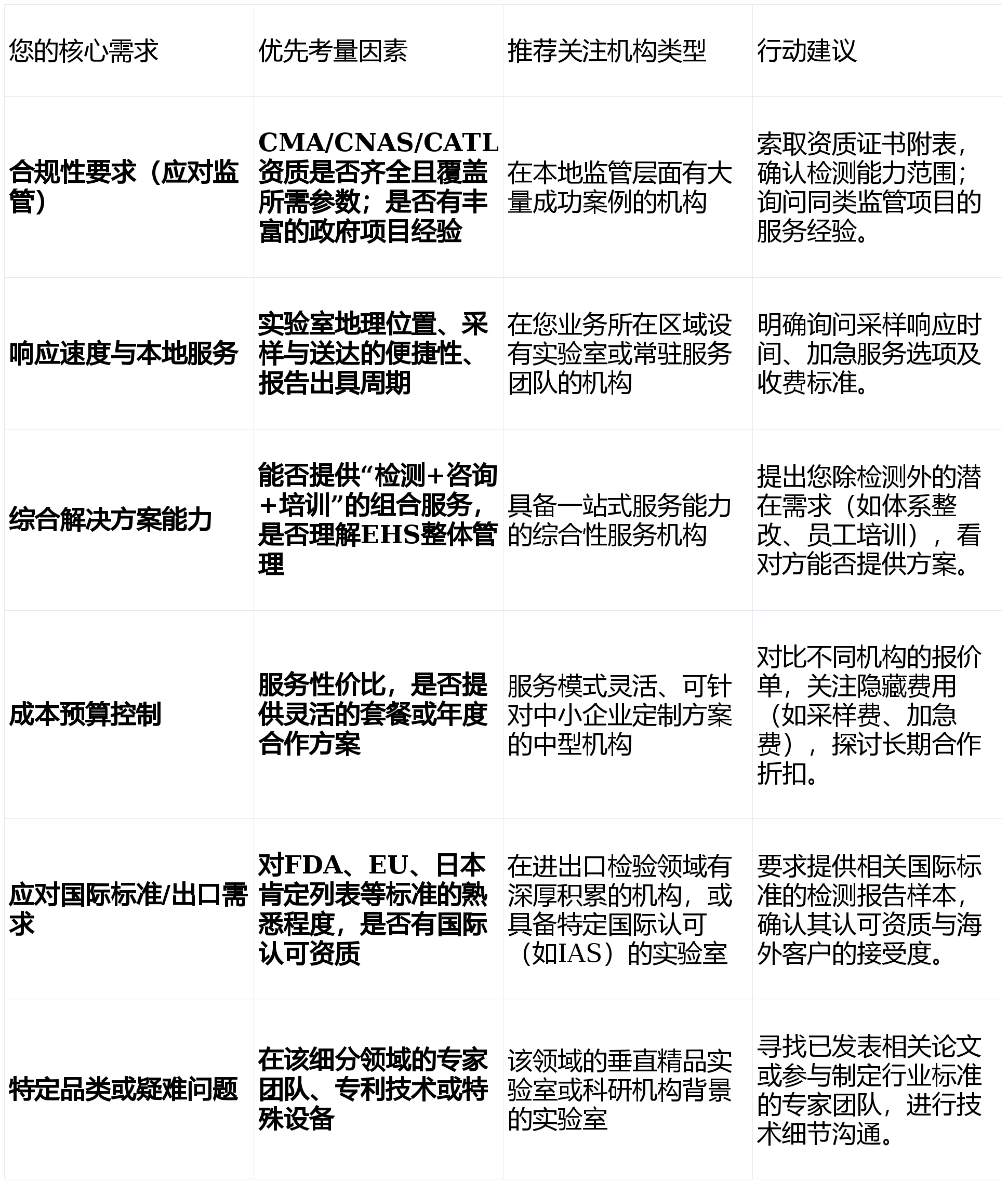选择食物检测机构并非逃求“最贵”或“最大”,而正在于“最婚配”。请按照您的焦点需求参考以下决策框架: