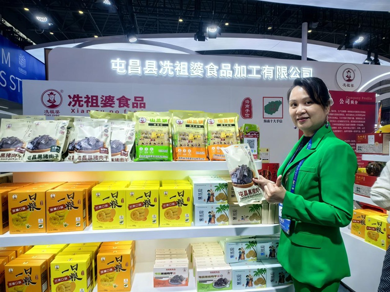 正在位于4号馆冼祖婆食物展馆,屯昌黑猪肉干、山兰米酥、斑斓曲奇、金砖年糕、冼夫人军粮饼(谷粮饼)等系列产物也出格受欢送。“她们家的粽子不错,包得紧致,吃完唇齿留喷鼻。”来自东方市的卢先生品尝后由衷赞赏。