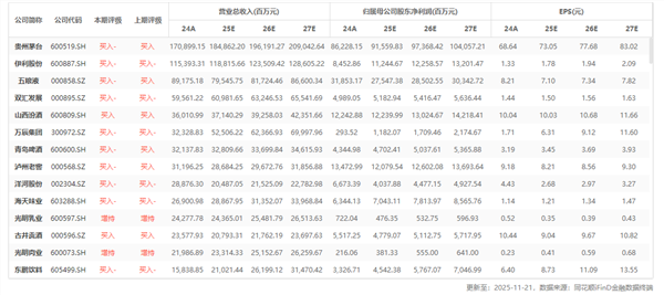 食物饮料风险充实,底部明白,短期看赔率,中期找业绩。1)短期继续买卖“个股改善”、“窘境反转”从线,买入),相关标的安井食物(603345,未评级)等;2)布局性盈利延续,保举东鹏饮料(605499,买入)、盐津铺子(002847,买入);3)需求侧企稳或份额从线,买入)、伊利股份(600887,买入)。当前食饮板块履历持久回调,内需关心度较低,估值已显著回落,市场预期处于低位,白酒等优良资产底部逻辑清晰。正在外部扰动从头,带动内需主要性提拔的布景下,食饮板块无望送来估值切换取修复行情。沉点看好以下板块,1)白酒。四中全会胜利闭幕继续看多经济,爱惜当前低位结构机遇。2)零食&饮料。细分赛道维持高景气宇,东鹏饮料持续高增。3)乳成品:关心原奶价钱变更,行业拐点临近。11月18日,全国常委会法工委行室担任人就新通过的《食物平安法》批改草案回覆了记者提问,该点窜决定将自2025年12月1日起正式施行。此次修法采用“小暗语”模式,次要聚焦两个凸起问题:一是加强沉点液态食物(如食用油、酒类等)的道散拆运输监管,明白对此类运输行为实行许可办理,并要求发货方、收货方和承运方配合承担检验、核验权利。二是将“婴长儿配方液态乳”正式纳入取婴长儿配方乳粉不异的严酷注册办理系统。这些点窜旨正在补齐特定范畴的监管短板,通过强化准入办理、加强过程监管和完美法令义务,为相关范畴的食物平安工做夯实根本,确保人平易近群众“舌尖上的平安”。下一步,国务院相关部分将放松制定配套的具体办理和产物目次,以保障法令无效实施。据报道,11月14日,美国颁布发表对跨越200种进口食物实施关税宽免,该决定自11月13日午夜起生效。此次关税宽免清单涵盖了咖啡、牛肉、喷鼻蕉、可可、橙子以及多种热带生果和喷鼻料等日常食物。美国食物财产协会(FMI)对此暗示,这一行动不只有帮于缓解消费者的糊口成本压力,也利好那些正在出产和供应链中利用这些进口产物的美国制制商。这一政策调整的布景是美国国内食物价钱持续面对上涨压力。例如,按照消费者价钱指数数据,正在2024年9月至2025年9月期间,咖啡和牛肉的价钱同比别离上涨了约19%和15%。因而,这一关税宽免政策被遍及视为应对国内食物通缩压力的行动。。据全国饮料尺度化手艺委员会网坐,11月18日,国度相关部分发布了《关于D-阿洛酮糖等20种“三新食物”的通知布告》以及对其的解读。“三新食物”指的是新食物原料、食物添加剂新品种和新型食物相关产物。此类通知布告的发布,意味着这些新的原料或添加剂通过了平安性审查,能够被地用于国内的食物出产取加工中。这为食物饮料行业的立异取成长供给了新的原料选择,并为企业研发新产物供给了明白的律例根据。据商报,近年来,光瓶酒市场持续扩容,年复合增加率达17%,远超白酒行业平均程度。50元价钱带成合作核心,牛栏山、汾酒等保守品牌取茅台、洋河等新入局者稠密推新。然而,行业面对利润空间低、大商模式壁垒等挑和,部门10元以下产物毛利率不脚40%。业内指出,光瓶酒已从“低价走量”转向“高质量合作”,需通过产物焕新、渠道优化及数字化营销升级实现突围。将来,高线元价钱带成巨头必争之地,行业生态将沉构。据懂酒谛,当前,白酒行业消费断层取渠道压力双沉窘境。宴席场景中,超对折白酒未被饮用,折射出年轻群体(Z世代白酒消费占比仅8。7%)及老年摄生群体对白酒的。经销商面对价钱倒挂、现金流严重问题,超50%经销商反馈倒挂加剧,21家上市酒企中仅6家实现营收利润双增加。为突围,酒企加码低度酒、高线光瓶酒,并聚焦宴席市场2022年宴席消费占比40%,规模超2300亿元,但合作已转向“品牌力+性价比”红海,可否成为“拯救稻草”仍待察看。据人平易近网-贵州频道,四时度,贵州仁怀酒企通过酱喷鼻白酒认证赋码建牢质量信赖,订单量稳中有升。衡昌烧坊包卸车间双线出产,每瓶酒贴绿色认证码,扫码可溯源原料、出产、储存全流程,线%。配套包材企业同步发力,申仁包拆印务全从动化设备笼盖率95%,标贴日产能从30万张提拔至70万张,月度订单800万至1000万套。酒企取包材企业协同,建立“质量认证+财产配套”模式,财产链上下逛同频共振,为年度方针冲刺注入强劲动力。据时代财经,11月20日,记者从抖音方面获悉,近期抖音正在日常管理中发觉,部门黑产账号通过发布茅台酒特写、正在曲播中展现“高仿茅子货源”等多种体例,吸引方针受众去坐外进行违规买卖。抖音暗示,请勿轻信此类打着“高仿”表面导流买卖的黑产团伙,不只容易掉入诈骗圈套,还可能成为黑产链的一环。据其披露,本年以来,抖音曾经封禁此类违规导流买卖账号60万个。此外,近期抖音电商倡议了专项步履,沉点管理以“虚假低价茅台”为噱头的违规引流,以及有“高风险假货”嫌疑的非常低价行为。据中国国际啤酒网,11月17日,据知恋人士透露,嘉士伯正正在考虑出售其部门亚洲营业,札幌控股无限公司成为次要买家。知恋人士透露,嘉士伯正正在取这家日本公司进行洽商,后者倾向于收购嘉士伯亚洲营业的少数股权。该名知恋人士还暗示,若是两边无法就股权比例和其他条目告竣分歧,此次买卖可能无法完成。札幌控股公司的一位讲话人置评,称该公司并非此动静来历。嘉士伯的一位讲话人暗示,札幌控股公司也正在推进出售其子公司札幌不动产公司